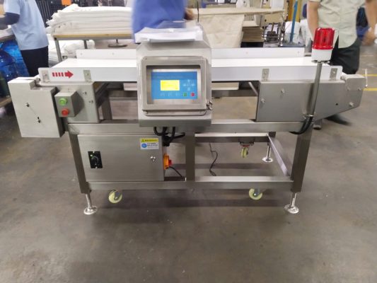 Model: MD-5513 Nhà sản xuất: Hashita Ngôn ngữ vận hành: Tiếng Anh Màn hình : LCD lớn dễ nhìn Thiết kế chống nước Phương pháp phát hiện kim loại: cảm ứng từ Khả năng kiểm tra: Sắt, đồng, thép không gỉ Chiều rộng khẩu độ: 550mm Chiều cao khẩu độ: 113mm Chiều rộng tối đa của băng tải: 500 mm Màu băng tải: màu trắng cấp thực phẩm Kích thước sản phẩm kiểm tra: + Chiều rộng tối đa: 500mm + Chiều cao tối đa: 95mm + Tốc độ vận chuyển: 0-30m / phút + Trọng lượng sản phẩm tối đa 15kg Vật liệu kết cấu máy: thép không gỉ SUS304 -Kích thước máy khoảng : 1600 x 830 x 950mm – Chiều cao của máy từ mặt đất đến bề mặt băng tải : 700mm (+50mm) có thể điều chỉnh -Độ nhạy máy (không sản phẩm): Fe=Ф1.0 mm; NFe=Ф1.2mm; SUS=Ф1.5mm Nguồn điện, điện áp cấp : AC 220V, 50-60HZ Hình thức báo động kim loại: âm thanh và báo động dừng lại với ánh sáng của đèn và bằng tải dừng lại. |